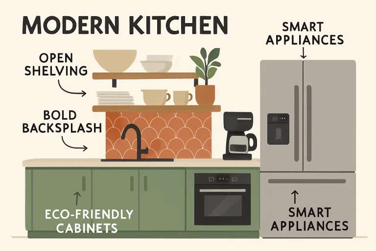 • Open shelving, bold backsplashes, and sustainable materials are trending in modern homes.