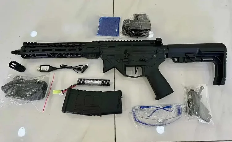 When you choose the SuGe F1 BD556, you’re not just getting a gel blaster—you’re receiving a complete kit designed for instant action. Each package includes the BD556 blaster, a high-capacity magazine, a sturdy sling for easy transport, front and rear sights for accurate aiming, a 7.4V USB charger and battery to keep you powered up, and a pack of gel balls to get you started right away. This all-inclusive setup ensures that you have everything you need to jump into the game without any additional purchases.